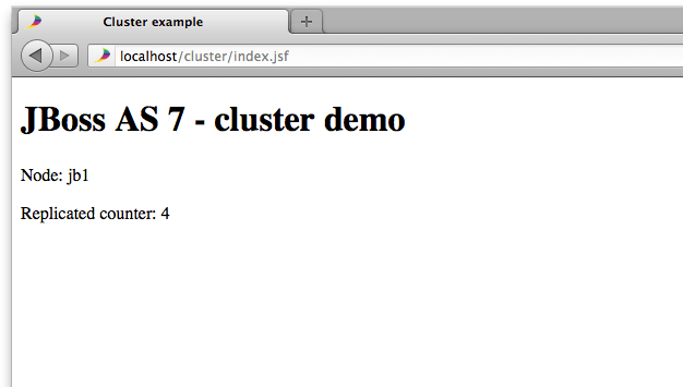 Um Clustering zu demonstrieren, beginnen wir mit einer einfachen Beispiel-Anwendung. Sie beinhaltet eine Stateful-Session-Bean, welche die Aufrufe zählt und die Implementierung einer stateless Session-Bean, die den Namen ihres Clusterknotens zurückgibt. Beide Session-Beans werden von einer JSF-Page aufgerufen. Die Anwendung liegt auf github im Verzeichnis cluster-example/. Die Anwendung wird mit Maven gebaut indem das mvn package Kommando ausgeführt wird. Das gepackte Web-Archiv ist dann im Verzeichniscluster-example/target zu finden.