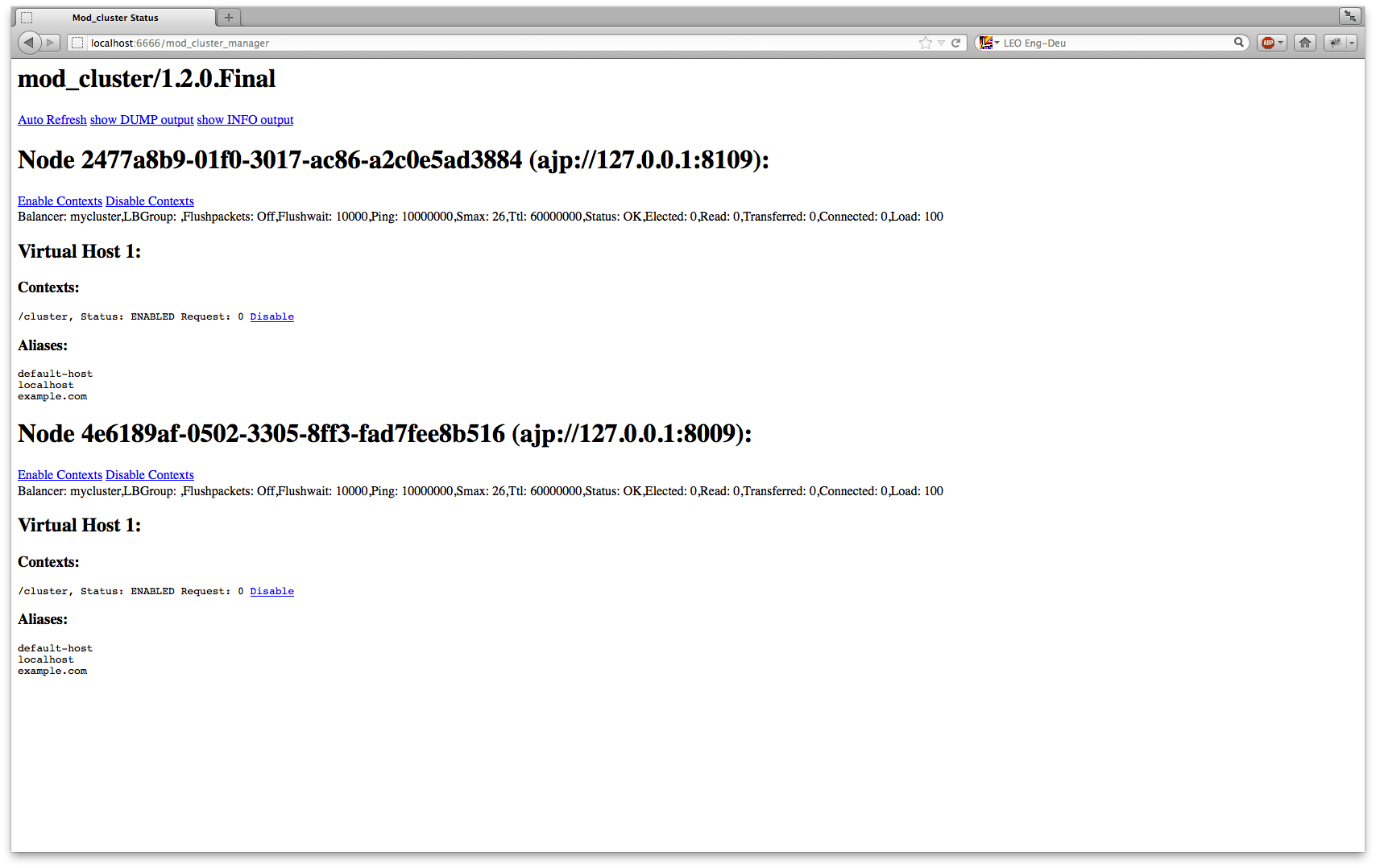 Das bedeutet, dass das ModCluster-Subsystem auf JBoss-Seite sich erfolgreich mit dem mod_cluster auf der Apache-Seite registriert hat. Wenn Sie http://127.0.0.1:6666/mod_cluster-manager in Ihrem Browser öffnen, sehen Sie einige Informationen über die Clusterknoten.